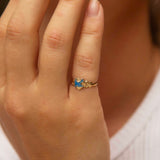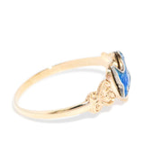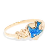 The delightful vintage Deryn Ring showcases an exquisitely enameled swallow resting on a heart-shaped setting crafted from 9-carat yellow gold. The detailed rendering of the swallow's plumage and the vivid blue enamel evoke a dynamic and lifelike presence, rendering the ring an enchanting creation.