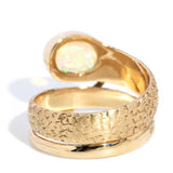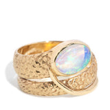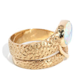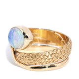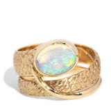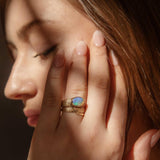 Crafted in 14 carat gold, our Becky Ring, inspired by nature and designed with whimsy, is a wonderful jewel. Her patterned band coils to a snake's head of vivid crystal opal that flashes blue, green and a hint of yellow and orange. A bold accessory for a bold woman.