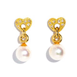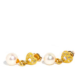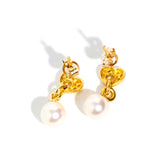 Crafted in 18 carat gold, these adorable vintage earrings each feature a plethora of diamonds in textured bubble heart settings with a gorgeous freshwater pearl suspended below. They are named The Almira Earrings. They look adorable no matter the time or place and are as lovely as the one who wears them.