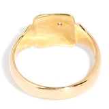 Forged in 9 carat gold, this elegant vintage signet ring features a star set diamond shimmering on a cushion-shaped top between flared shoulders. We have named her The Jared Ring. She puts a lovely finishing touch to your wardrobe and keeps a low profile, making her look the part no matter the time or place.