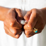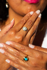 The Celine Ring belongs to our treasure trove of strongly sustainable, ethical, environmentally friendly, and conflict-free jewellery. She lives in our carefully curated collection of one of a kind vintage jewellery pieces. A vintage piece of jewellery has many stories to tell. Tales of romance, love, family, happiness and sometimes loss and endurance. Handed down from person to person, generation to generation. The Celine Ring is a piece of wonderful history.