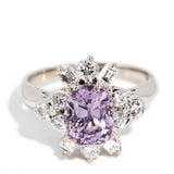 The bright pale purple spinel is estimated to weigh 2.49 carats and measures approximately 8.64x6.63x5.40 millimetres. The round brilliant cut diamonds and the baguette cut diamonds are estimated to total 0.62 carats with G colour and SI to P1 clarity grades.