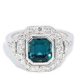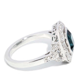 The perfect 18 carat white gold Sorrento Ring holds a cushion cut deep teal sapphire at her centre, set within a border of brilliant diamonds and with additional diamonds on the shoulders and down the sides.