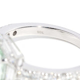 The hexagonal cut bright mint green tourmaline is 2.1 carats and measures approximately 9.5 x 7.5 x 5.2 millimetres. The baguette cut and round brilliant cut diamonds total 0.88 carats with F colour and VS to SI clarity grades.