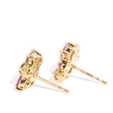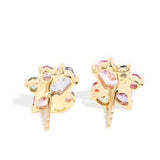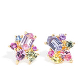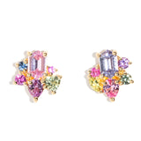 9 carat yellow gold contemporary stud earrings are in the shape of a rock cluster with sapphires in hexagonal, pear, round and marquise shapes and shades of pink, green, blue, yellow and purple.