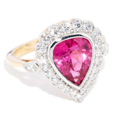 This exquisite 18 carat yellow & white gold Erin Ring features a captivating pink pear-shaped tourmaline framed by a dazzling halo of brilliant white diamonds. A perfect statement for those who cherish beauty and passion intertwined.