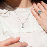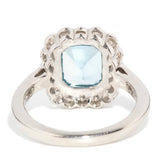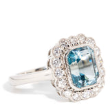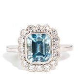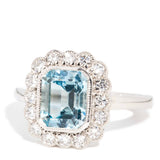 Thoughtfully crafted in shimmering platinum, this incredible contemporary splendour rocks a stunning emerald cut aquamarine in an elegant milgrain setting and within a captivating border of round brilliant cut diamonds. We have named her The Nilima Ring. Her gorgeous facets bathe the wearer in a spectacular dance of blue and white light, making her a prefect adornment for turning heads.