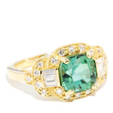 The square cushion cut bright green tourmaline is 3.02 carats and measures approximately 7.8 x 7.9 x 6.7 millimetres. The round brilliant cut diamonds and the baguette diamonds total 0.51 carats with F colour and VS to SI clarity grades.