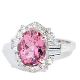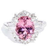 The lovely 18 carat white gold Airlie Ring holds a captivating oval pink tourmaline set within a border of round brilliant and baguette cut diamonds.