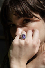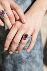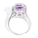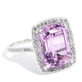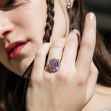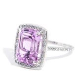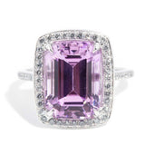 A blushing beauty with a heart of love, The Claudia Ring showcases a captivating 7.18 carat emerald cut Kunzite, her radiant purple hue evocative of dusk on warm summer days. Framed in a halo of shimmering diamonds she is a glamorous beauty.