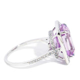 The bright purple emerald cut Kunzite gemstone is 7.18 carats and measures approximately 12.9x9.1 millimetres. The round brilliant cut diamonds are estimated to total 0.42 carats with G colour and SI to P1 clarity grades.