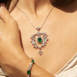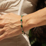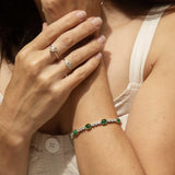 A breathtaking masterpiece, where emeralds, like verdant jewels, dance amidst a cascade of sparkling diamonds. Our exquisite Shai Tennis Bracelet, crafted in 18-carat gold, is bold symphony of color and light that exudes timeless beauty and sophistication. Each emerald, a testament to nature's artistry, shimmers with a vibrant green hue, while the diamonds add a touch of brilliance. A truly unforgettable piece, it is the perfect accessory for any occasion.