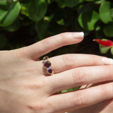Amidst the glow of its rhodolite garnet, this exquisite 9 carat gold ring captures the heartbeat of passion and elegance. Flickering diamonds whisper like stars against a twilight sky, casting enchanting reflections that dance with every glance. Adorn yourself with this darling jewel, and feel the vibrant spirit of love and artistry embrace your soul.
