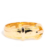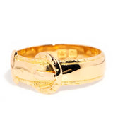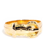 Brittany, an exquisite antique belt buckle ring, captures the essence of the Edwardian era and its transition to the modern era, crafted in opulent 18 carat yellow gold.