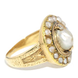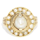 One central baroque pearl measures 6.50x7.00 millimetres. The surrounding seed pearls measure 2.25 to 2.50 millimetres. Under the setting is a concealed hinged compartment.