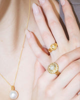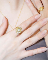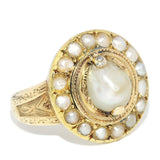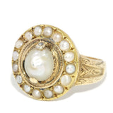 Nyssa, is a Victorian treasure with a warm semi-baroque pearl nestled within a halo of smaller pearls in 18 carat gold. She whispers tales of hope and endurance, her iridescence capturing the warmth of bygone days. An enchanting relic crafted for those who cherish nature's artistry and history's embrace.