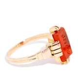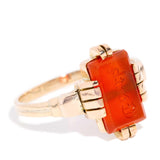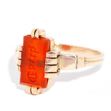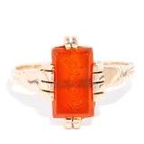 Our Poppy Ring is crafted in 9 carat yellow gold, her vibrant orange carnelian stone a burst of warmth and elegance. The intricate engraving on the carnelian adds a touch of history and mystery, making her a unique and captivating piece. The warm glow of the gold band complements the rich hue of the carnelian, creating a harmonious and timeless design.