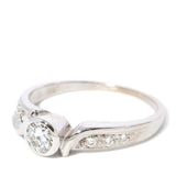 Diamonds are estimated to total 0.35 carats. The central round brilliant cut diamond is estimated to weigh 0.24 carat, with G colour and VS1 clarity grade. The round brilliant cut shoulder diamonds are estimated to weigh 0.11 carat, with F to G colour and VS clarity grade.