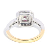 The Asscher cut diamond is estimated to weigh 0.57 carats with H colour and VS1 clarity grades. The round brilliant cut diamonds are estimated to total 0.24 carats with G to H colour and VS to SI clarity grades.