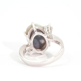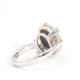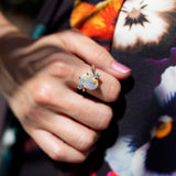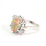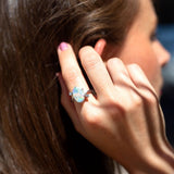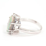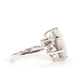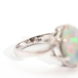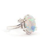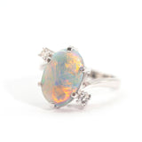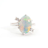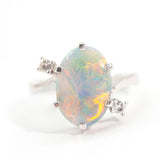 Forged in 18 carat white gold, this handmade enchanting vintage ring features a striking 3.50 carat solid oval Australian opal flanked by two round brilliant cut diamonds. We have named this gorgeous vintage piece The Indus Ring. The Indus Ring's opal throws strong flashes of orange, green, blue and yellow play of colour. The Indus ring is perfect for the person looking for a ring as unique as they are.