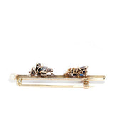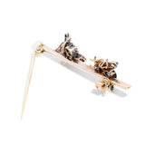 Our lovely Bee Bee Brooch is a delicate 14 carat yellow gold bar adorned with two buzzing bees, each set with diamonds and sapphires. A chipped sapphire adds a touch of uniqueness, while a cultured pearl completes the piece, a testament to craftsmanship.
