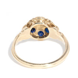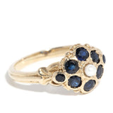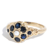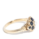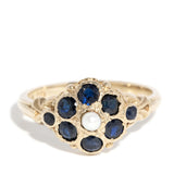 Our Blair Ring is a gorgeous vintage jewel. Her cluster of rich blue sapphires surrounds a luminous pearl, creating a wonderful contrast. Crafted in 9 carat gold, she is a touch of elegance, a timeless treasure.