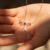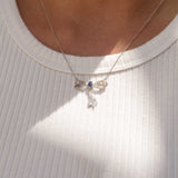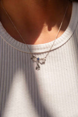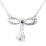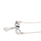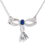 This exquisite necklet features a stunning blue sapphire wrapped in a ribboning bow of diamond-embellished 18 carat white gold. All vivid blue and shimmering light, she exudes a sense of grace and femininity. We have named her Sienna, the perfect gift for your perfect someone.