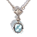 Crafted in platinum, this fabulous contemporary adornment features a stunning emerald cut aquamarine in a claw setting and articulating from a a diamond-shaped bail set with shimmering diamonds and threaded with a fine chain. The Kailani Pendant & Chain is as elegant as the one who wears her, perfect no matter the time or place and rests comfortably close to the heart.