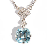 The bright light blue square emerald cut aquamarine is 2.32 carats and measures approximately 8.00x7.5x6.02 millimetres. The round brilliant cut diamonds total 0.04 carats with F colour and VS clarity grades.