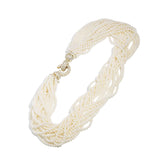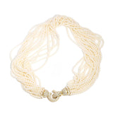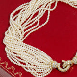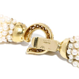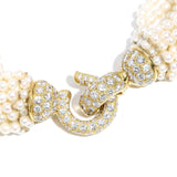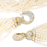 This stunning 1970s Cartier necklace is home to 2193 Akoya cultured pearls set between multiple strands in perfect harmony. At the ends are captivating 18 carat yellow gold clasps pave set with 99 round brilliant cut diamonds shimmering like stars reflected in the veil of sky.