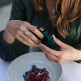 The Saville Ring belongs to our Freedom Collection. Each piece in the Freedom Collection is slow fashion at its finest. Uniquely designed and crafted with at least 95% reclaimed gems, diamonds, gold & platinum. Diamonds, gemstones and precious metals can last many lifetimes, an eternity in fact, unlike some jewellery designs. The freedom collection is ethical fashion, handcrafted from previously loved jewellery. Know that your stunning jewellery makes the lightest of footprints on our earth.