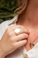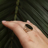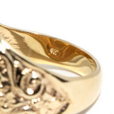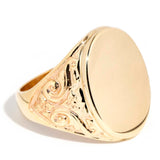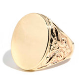 Forged in 9 carat gold, this wonderful vintage ring features elegant paisley patterned shoulders rising to a high polish oval top with space for a personal engraving. Her name is The Tennyson Ring. She is a lovely ring for adding that perfect finishing touch to your wardrobe of choice and is perfect for everyday wear.