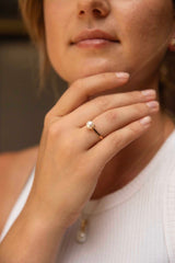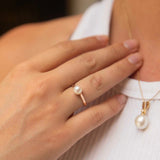 A blush of 9 carat rose gold cradles a moonlit pearl, a timeless dance of precious metals and the ocean's kiss. Our Kynlee Ring is a sweet reminder of yesteryear, a sonnet of elegance in today's world.