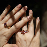 The 18 carat yellow gold Fahari Ring holds a bright purple sapphire within a halo border or round and oval bright pink and purplish pink sapphires.