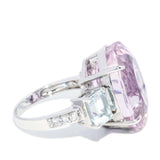 The light pink oval cut Kunzite measures 19.73 x 14.24 x 10.57 millimetres with an estimated weight of 19.83 carats. The two pale blue emerald cut aquamarine measure on average approximately 7.00 x 5.30 x 4.18 millimetres with an estimated weight of 2.25 carats. The six round brilliant cut diamonds are estimated to total 0.18 carats with a F to H colour and VS1 to SI2 clarity grade.
