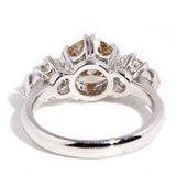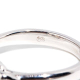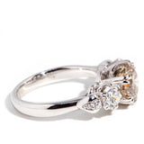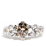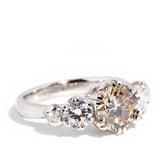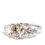 The centre round brilliant cut diamonds is 2.00 carats and KL colour and P1 Clarity. The two side diamonds total 0.83 carats and are of G colour and SI-P1 Clarity. The two smaller diamonds and 0.05 carats, F Colour and VS Clarity. The two smallest diamonds total 0.02 carats and are F Colour and VS Clarity.