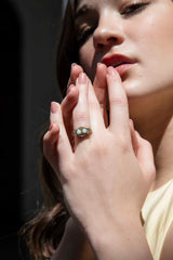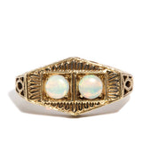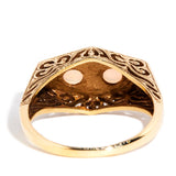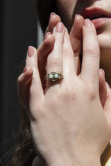 The 9 carat gold Harlowe Ring is a nod to the Golden Age of cinema, her structured lines reminiscent of a time when cinema, architecture and fashion pulsed with a style that is still sought after today. Her blue green opals sit atop an opulent stage that allows them to luxuriate in the spotlight.