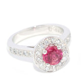 The deep pink round cut tourmaline measures approximately 5.74 x 5.65 x 3.80 millimetres with an estimated weight of 0.73 carat. The twenty-five round brilliant cut diamonds are estimated to total 0.42 carat with a F colour and VS1 to SI1 clarity grade.