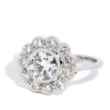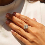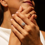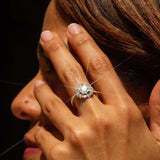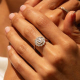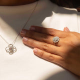 The Wallace Ring is a design marvel, symbolizing deep intentions. Her central diamond, akin to a daisy's heart, sparkles like morning dew. Surrounding it, a halo of fine diamond petals forms an enchanting motif, evoking the image of a blossoming flower. Her 18-carat white gold setting offers a refined and stylish backdrop, making this radiant floral creation a treasure of beauty and elegance.