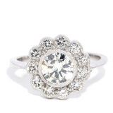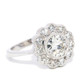 The centre round brilliant cut diamond is estimated to weigh 0.90 carats, is I colour and VS1 clarity. The surrounding eleven round brilliant cut diamonds are estimated to weigh 0.44 carats, is I to J colour and SI to P1 clarity grades.