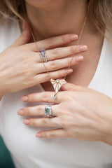 The Shira Ring is part of our Freedom Collection, a celebration of slow fashion at its finest. Each jewel in this collection is uniquely designed and expertly crafted by our talented jewellers using up to 95% reclaimed gems, diamonds, gold, and platinum. Diamonds, gemstones, and precious metals are treasures that can last for lifetimes—an eternity, in fact—unlike fleeting jewellery trends. The Freedom Collection represents ethical fashion, thoughtfully handcrafted from previously loved jewellery for the lightest of footprints on Earth.
