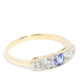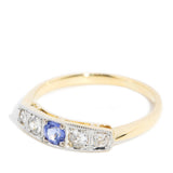 A delicate dance of light and colour, the Sholmo Diamond Sapphire Band is a picture of understated beauty. Sparkling old cut diamonds frame a central, serene blue sapphire, all set within a band of 18 carat yellow and white gold. She is a whisper of elegance, a perfect complement to any style.