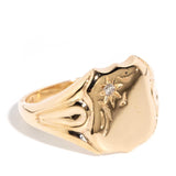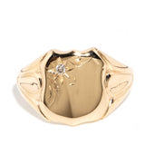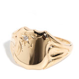 We have named our 9 carat gold shield ring Calvin. With curved shoulders, a lightly engraved platform and star-set with a shimmering diamond, he is a handsome addition to any jewellery collection.