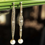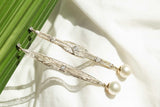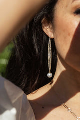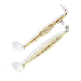 An elegant open pattern platinum front, warmed by soft 14 carat gold yellow gold hues and perfectly finished with 9 carat white gold studs tops, hearken back to elegant soirees and romantic evenings. Shimmering diamonds enhance the tapestry as lustrous South Sea pearls radiate below. A timeless treasure, these earrings are a perfect symphony that whisper tales of forgotten love.
