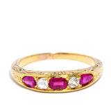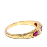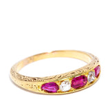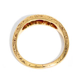 A timeless treasure from the Edwardian era, the 18 carat gold Frankie Ring features vibrant rubies and old cut diamonds in an elegant, classic setting. Delicate engraving along the band enhances its antique charm, offering a beautiful blend of history and sophistication. A romantic piece that captures the essence of a bygone time, it’s perfect for vintage jewellery lovers.