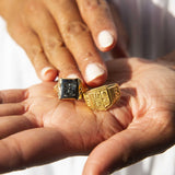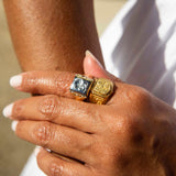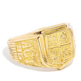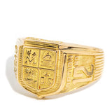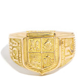 Forged in 18 carat gold, this classic graduation ring features an intricate shield emblem in four sections, each with a symbolic motif and celebratory graduation symbols down each side of the grooved band. Her name is The Elliot Ring. She is a true celebration of unity and success that holds memories carried on through eternity.