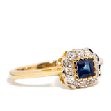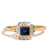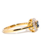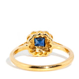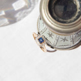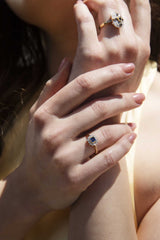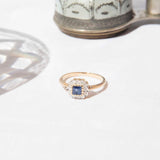 The 9 carat gold Eloise Ring is a delicate reimagining of a vintage flower. Her radiant blue sapphire, surrounded by a halo of sparkling diamonds is a sweet gift for that someone special. Inspired by the romance of the silver screen she is looking for her happily ever after.