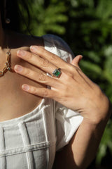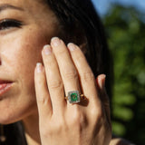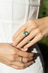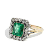 Our Asta Ring with her vivid green emerald in a frame of sparkling diamonds is a grand jewel. Crafted in 18 carat gold she is a rich and enduring treasure that will become your family's legacy for generations to come.