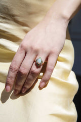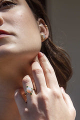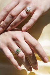 A glorious gem, the 9 carat yellow gold Gene Ring is a reminder of a Hollywood long passed. Her beautiful opal of blue, green and orange light is framed with vivid green emeralds and glittering diamonds. She is a masterpiece of style and glamour, either treading the boards or walking the red carpet - she belongs.