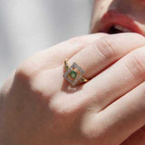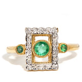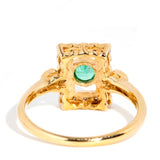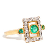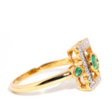 A delicate lace frame of diamond embellished gold presents a gorgeous emerald that shines bright with intensity matched only by the emeralds buttressed at her side. She is the 9 carat gold Francie Ring, made to capture the profound sweet fragility of loves first blush.